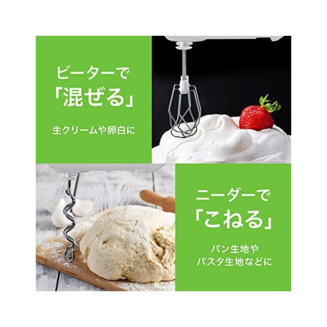 ビーターで「混ぜる」、ニーダーで「こねる」が可能。ツールはボタンをワンタッチするだけの簡単操作で交換可能。