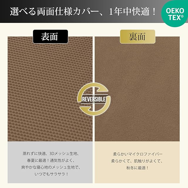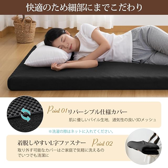 【四季適用&便利】マットレスは選べる両面仕様カバーを採用して、1年中快適で、オールシーズン適用です!表面は3Dメッシュ生地で通気性がよく、爽やかな寝心地で、いつでもサラサラ!裏面は柔らかいマイクロファイバーで、柔らかくて、肌触りがよくて、秋冬に最適!L字型ファスナーでらくらく着脱!カバーは取り外して洗濯可能で、いつも清潔にお使いいただけます。