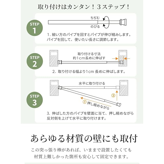 利用シーン:クローゼット内の収納、室内・ベランダでの物干し、カーテンレール、収納棚として2本使用、キッチンツール収納、インテリア用途。