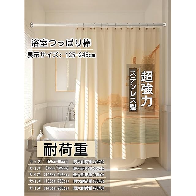 取付寸法:125cm-225cm。付属品:カーテンリング12個付き。最大耐荷重:25kg、重いものを吊るしても安心。