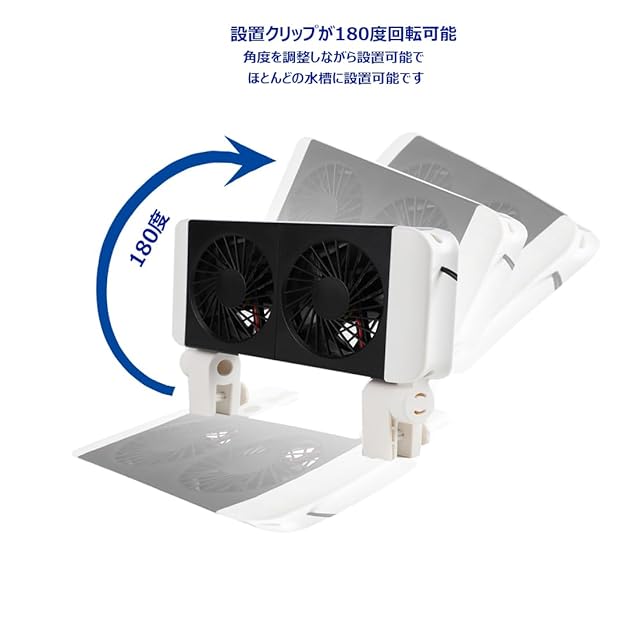 [180度回転調整可能な水槽冷却]水槽ファンのファンが180度調整できる設計で、ご使用されてる水槽の角度に合わせて調整できる、設置がとても簡単で、ご利用にもっと役立ちます。