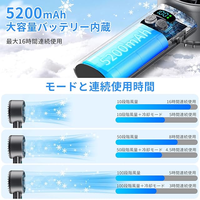 【最大16時間連続使用&Type-C充電式】5200mAhのバッテリーを内蔵し、フル充電の場合、送風モードで最大約16時間の連続使用可能、送風モードと冷却モードの組み合わせは最大約5時間連続使用可能。酷く暑い日に一日中外出しなければならない場合も、この一台で涼しい風を自由に楽しめる、熱中症対策の役に立つ。Type-C充電式で様々な充電方法が対応でき、充電しながらの使用も可能で、使用中電池切れの心配はありません。