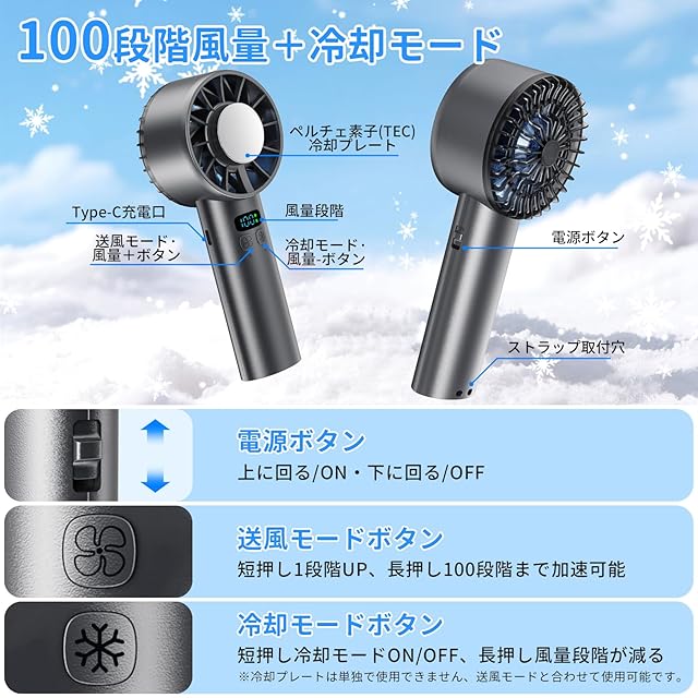 【超高速モーター&100段階強風】ドローンにも使用される高速モーターを内蔵し、12枚羽根で風量アップ!旧バージョンと比べ、より効率的に送風可能、300%風量アップし、30km/h究極な風速を実現する。1-100段階風量を調節可能、気温によって自由に調節可能。使用方法:①電源ボタンを上に回る/電源ON·下に回る/電源OFF。②左側の送風ボタンを押して、送風モードが稼働し、風量10段階で表示され、送風ボタンを短押しして1段階風量UP、長押し100段階まで加速可能。③右側の冷却ボタンを押して、冷却モードが稼働し、さらに短押しして、冷却モードが停止する、冷却ボタンを長押しして、風量を減らすことができます。※冷却プレートは単独で使用できません、送風モードと合わせて使用可能です。