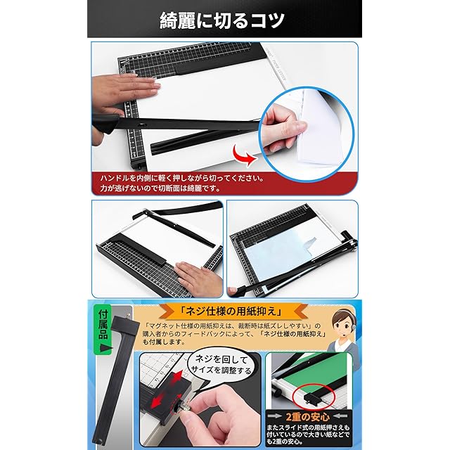 ✅【ペーパーカッター A4サイズ】「マグネット仕様の用紙抑えは、裁断時は紙ズレしやすい」の購入者からのフィードバックによって、「ネジ仕様の用紙抑え」も付属します。 切断サイズ:B7/B6/A5/B5/A4対応 カット可能サイズ:320×250mm 最大裁断枚数:コピー用紙 12枚まで 資料や用紙の裁断、事務作業などにとっても便利です。コピー用紙、種類などの直線裁断用、最大 A4サイズまでの用紙の重ね切りが楽にできます。硬めの紙の場合はやや少なくなります。