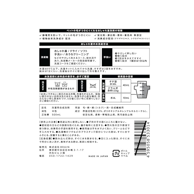 本商品は、正規販売元「販売店名ペットの毛がつきにくくなるおしゃれ着洗剤(株式会社BRAIN)」が販売・する商品のみが対象となります。 転売業者等からご購入された場合、品質・サポートの対象外となる可能性がございます。安心してご利用いただくために、販売元をご確認の上、ご購入ください。