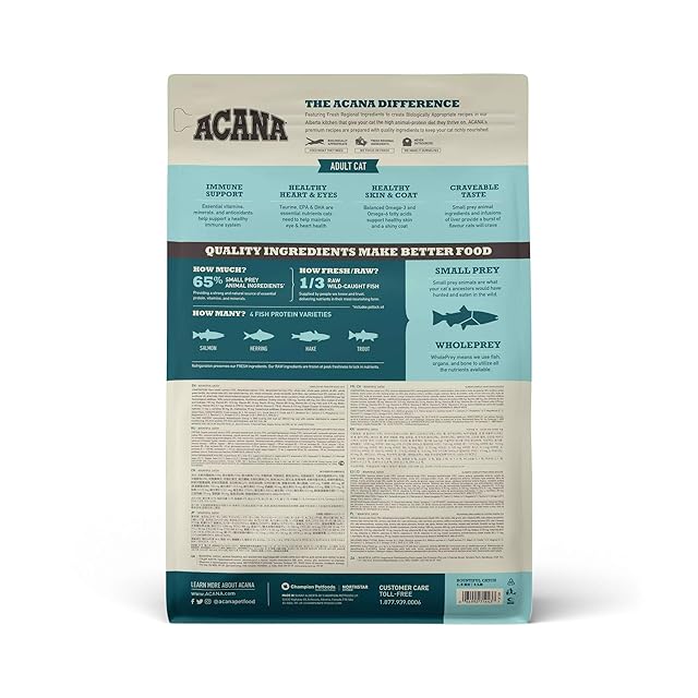 生の丸ごとサーモン(15%)、ディハイドレートサーモン(15%)、ディハイドレートニシン(15%)、ホールオーツ、丸ごとエンドウ豆、ポロック油(8%)、丸ごと緑レンズ豆、生の丸ごとヘイク(4%)、生の丸ごとニシン(4%)、丸ごとヒヨコ豆、丸ごと赤レンズ豆、レンズ豆繊維、生のニジマス(2%)、サーモン油(2%)、ヒマワリ油、乾燥ケルプ、新鮮丸ごとバターナッツスクワッシュ、新鮮丸ごとカボチャ、新鮮丸ごとクランベリー、新鮮丸ごとブルーベリー 酸化防止剤:天然成分から抽出したトコフェロール 添加栄養素(1kg中):塩化コリン1200mg,タウリン400mg,亜鉛(アミノ酸水和物の亜鉛キレート)150mg,ビタミンB1 12.5mg,ビタミンB2 10mg,ナイアシン50mg,ビタミンB5 8mg,ビタミンB6 6.5mg,葉酸0.75mg,ビオチン0.125mg,ビタミンB12 0.1mg,,ビタミンA 3750IU,ビタミンD 500IU,ビタミンE 170IU,ビタミンK 0.5mg,銅(アミノ酸水和物の銅キレート)11mg,L-カルニチン50mg,DL-メチオニン99mg 添加腸球菌:エンテロコッカス・フェシウム菌
