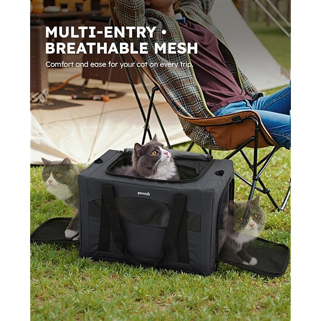 【安定して快適】:多入口デザインで、猫用キャリーの上部と側面の開口部からペットが出入りしやすいです。⭐⭐車内の安全設計では、シートベルトとショルダーストラップによる二重固定を採用し、車内の環境を安定させ、旅行中のペットの安全と快適さを保ちます。