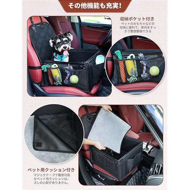 【主人が安心して運転できる】飛び出し防止リード付きなので、カーブや急ブレーキなど際に、ペットの体をしっかり支え、瞬間の飛出しを防ぎます。背面には2本の固定用のベルトつきなので、座席の背もたれとしっかり固定できます。車酔い防止にも効果抜群です。