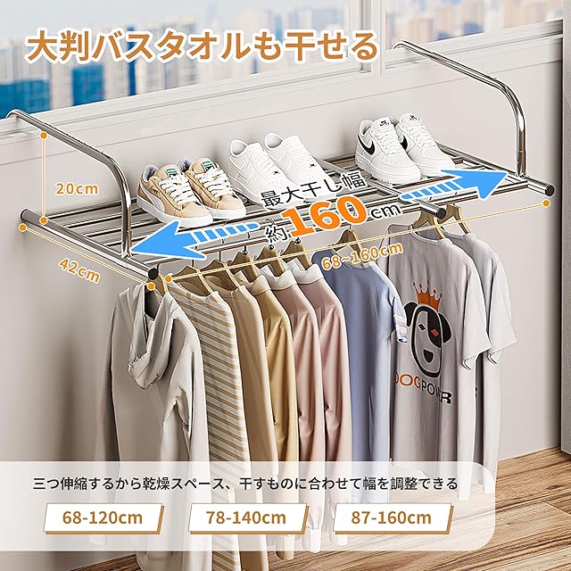 【3サイズ、68~160cm自由に伸縮】物干しラックは横幅68~120cm、横幅78~140cm、横幅87~160cm三つサイズある、お好みの長さに十段自由に伸縮することができます。物干しラックの管の間隔がわずか9cmで、物を干した際に落下する心配はなくなります。5つの小さなハンガー付き、靴下などの小物小さな小物を干す際に便利です。