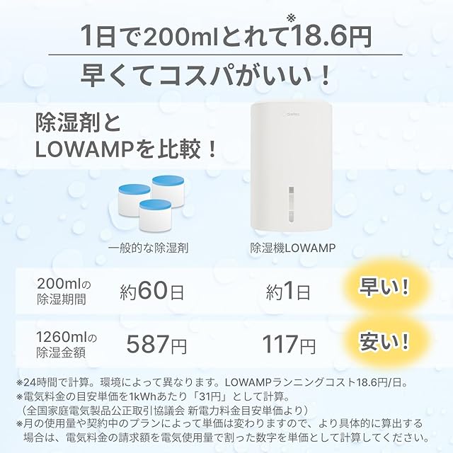 【環境に優しく経済的!パワフルなペルチェ式除湿】 本製品はペルチェ式を採用した除湿器です。ペルチェ素子によって湿気を含んだ空気を効率的に冷却し、結露させ水滴として回収することで、強力な除湿を実現します。一般的な除湿剤が約60日かかる200mlの除湿を、この除湿機ならたった24時間で完了!1日あたりの電気代も※約18.6円と省エネで、お財布にも優しい設計です。また、除湿剤に溜まる水は環境によくない成分が入っているとされていますが、ペルチェ式は本体内に結露させた水を貯める方法のため排水する時も環境に影響を与えません。排水も環境に配慮されており、クリーンに湿気対策が行えます。日本メーカーのdretec(ドリテック)でPSE認証を取得済みで、品質面のサポートも万全です。(※ランニングコスト18.6円/日。電気料金の目安単価を1kWhあたり「31円」として計算。)