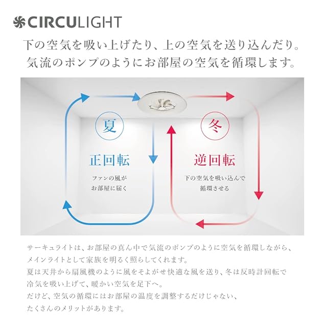 サーキュライトは「ライト」と「サーキュレーター」を組み合わせたシーリングファンライトです。天井に設置する事で循環効率がアップし、足元に置かないので邪魔にならず小さなお子様やペットがいるご家庭におすすめです。