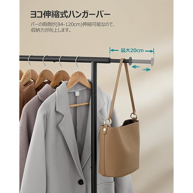 商品名:SONGMICS ハンガーラック 伸縮式衣装ラック 頑丈 洋服掛け 幅84~120cm スリム 室内物干し 衣類収納 安定性 キャスター付き移動しやすい ちょうどいいサイズ ブラック HSR134B01