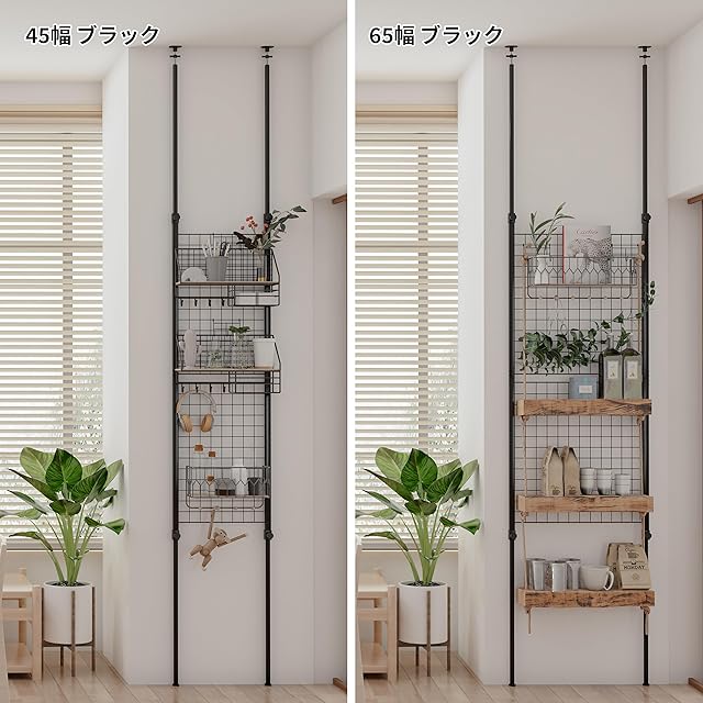 商品名:LunarLight 突っ張りメッシュパネル 突っ張り棒 突っ張りパーテーション (ワイヤーネットメッシュタイプ)幅45-65奥行2.5×高さ165-290cm (3連体Sフック2個付き) 壁掛け 小物展示収納 壁面収納 天井 間仕切り 頑丈 組立簡単 耐震転倒防止 (ブラック, 幅45cm)
