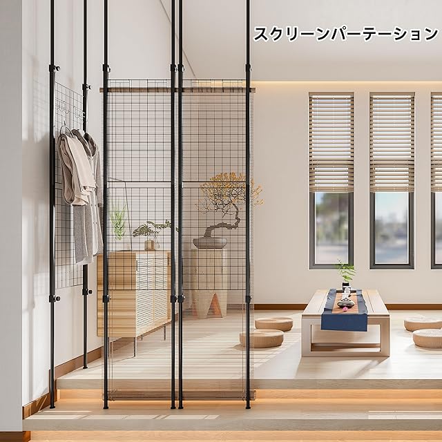 【多機能】:突っ張り設置式のパーテーション、50*50mmサイズ密集メッシュワイヤータイプでたっぷり収納。高さ165-290cmの伸縮が広いなので、低いところでも、高い天井でも対応できる。