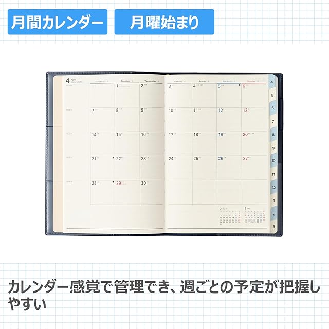 【商品説明】社会人にはもちろん、学生にもおすすめのウィークリーダイアリー開きたい月がすぐに見られる便利なインデックス付き。カバー前側には3段名刺ポケットが付いています【月間ページ】見開き1ヶ月のベーシックなブロックタイプ(月曜始まり)。カレンダーと同じような感覚で見ることができ、週ごとの予定が把握しやすいのが特徴です。【週間ページ】見開き1週間で全面に時間軸を配置したバーチカルタイプ。1日に複数の予定が入る、スケジュール管理を重視したい方におすすめです。モデルチェンジ:●扉のデザインを変更しました●月の最後のメモページのレイアウトを変更しました