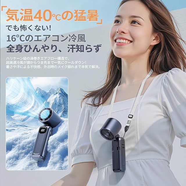 【100段階のパワフル風量】ハンディファンの風量は1から100までダイヤルで細かく調整できます。お好みの風力を自由にカスタマイズ可能。オフィスや電車など公共の場では中風で快適な風を、屋外では強風や弱風+冷却モードで快適にハンディファンをご使用できます。最新の高速モーターにより、通常の送風機よりも風力をアップさせている的同时に、通常のハンディファンより静音です。首掛け扇風機の超小型ヘッドは、風力を効果的に集中させ、よりワイドで強力な風を送り、ムレや熱気を効果的に除去します。