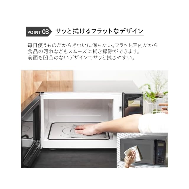 【便利なフラットタイプ】 庫内はターンテーブルのないフラット構造なので、コンビニ弁当などの大型の食材もあたためられます。さっと拭けて、お手入れもかんたんです。