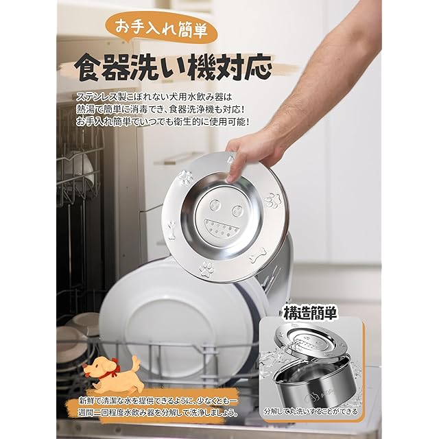 【ステンレス製丨頑丈で長持ち、お手入れ簡単】食品グレードの304ステンレス製犬給水器は丈夫で錆びにくく、愛犬が咥えたり噛んだりしても壊れない耐久性があり、長く使い続けることができます。ステンレス製こぼれない犬用水飲み器は熱湯で簡単に消毒できるため、いつでも衛生的に使用できるし、食器洗浄機も対応でお手入れ簡単です。
