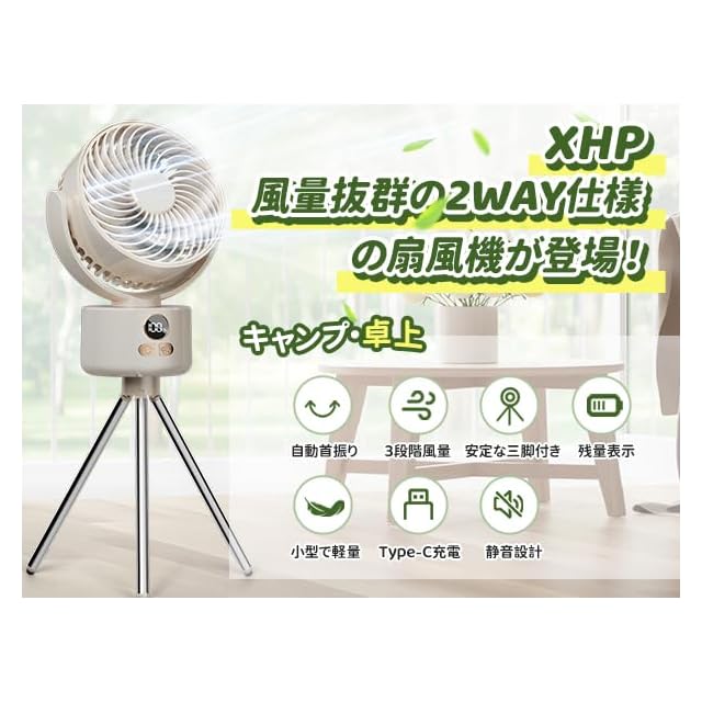 商品名:XHP 卓上扇風機 自動首振り キャンプ 扇風機 三脚スタンド付き 風量3段階調節 LED電池残量表示 風量段階表示 三脚ファン デスクファン 1台多役 充電式 せんぷうき アウトドア コードレス Type-C充電式 充電しながらも使用可能 4枚羽根 お手入れが簡単 静音 熱中症対策 小型 軽量 リビング オフィス 車中泊 アウトドア キャンプ用品
