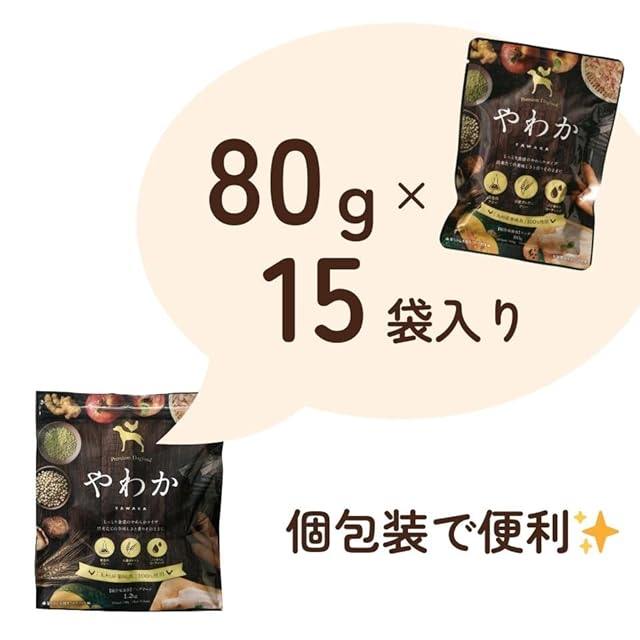 【商品紹介】<br /> やわかは、水たき料亭 博多華味鳥が作ったプレミアムな国産ドッグフードです。 人間もおいしく食べられる新鮮な鶏肉である、自社飼育の華味鳥を原材料に100%使いました。安全にこだわり、香料、着色料、オイルコーティングなど一切不使用です。<br /> <br />食感が柔らかいセミモイスト仕様のため、噛む力が弱い子犬やシニア犬のワンちゃんでも食べやすく、適度な硬さもあるため、顎の力を衰えさせることもありません。<br /> <br />【原材料】<br /> 鶏肉、玄米、大麦、かつお節、大豆、ビール酵母、チキンエキス、米油、卵黄粉末、発行調味液、フラクトオリゴ糖、りんご、にんじん、かぼちゃ、昆布、しいたけ、コンドロイチン、セレン酵母、しょうが、ビフィズス菌、グルコサミン、L‐トレオニン、ミネラル類(牛骨カルシウム、塩化カリウム、塩化ナトリウム、グルコン酸亜鉛、ピロリン酸第二鉄、グルコン酸銅)、ビタミン類(ビタミンA、ビタミンD、ビタミンE、ビタミンB2、ビタミンB12、パントテン酸カルシウム)<br /> <br /> 【成分値】<br /> エネルギー 287kcal/100g<br /> タンパク質 17.3%以上<br /> 脂質 7.6%以上<br /> 粗繊維 0.7%以下<br /> 灰分 5.7%以下<br /> 水分 27.0%以下<br /> <br /> 【保存方法】 <br /> 高温多湿・直射日光を避けて常温で保管してください。内袋は開封後、冷蔵庫に保管し、2日以内に使い切ってください。