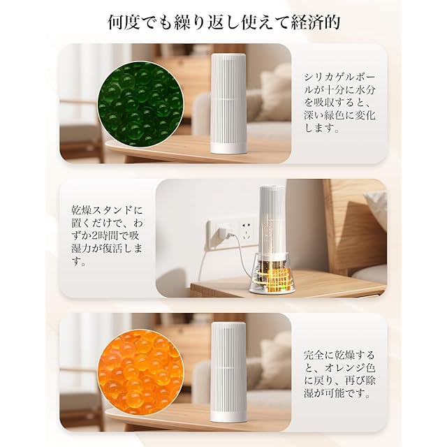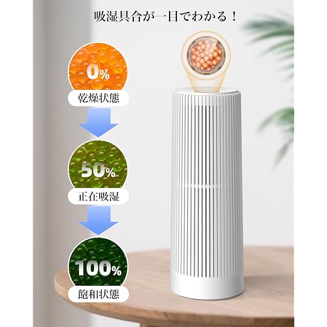 【見える除湿で安心】透明な窓から見える色の変化で、現在の除湿状況を確認できます:オレンジ色(乾燥中)→ 緑色(湿気吸収中)→ 深い緑色(完全に水分吸収済み)。