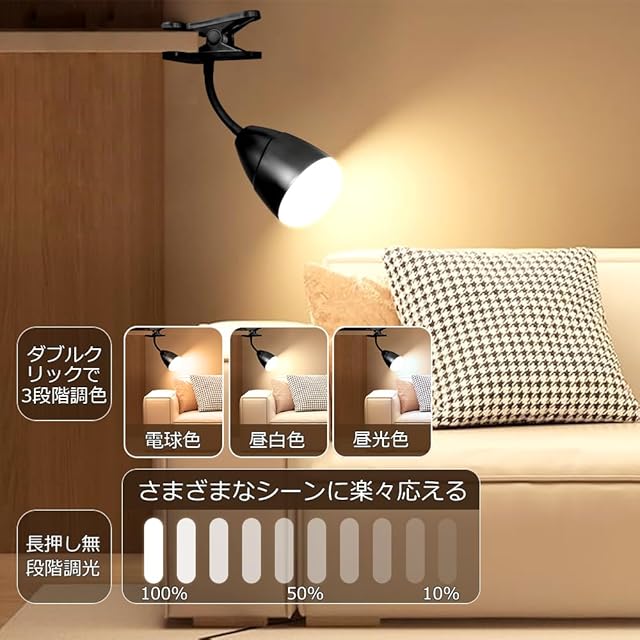 【安定感抜群の強力クリップ】最大直径5cmまで挟めるクリップを備え、滑り止めパッドがしっかり固定感をサポートします。机、本棚、ベッド、ピアノ、作業台など、幅広いシーンで設置可能です。また、拡散カバーを採用しているため、眩しさを抑えながら均一な光を広範囲に届けます。