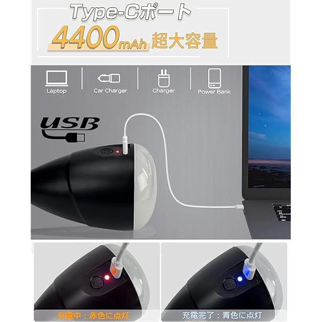 【USB充電対応・大容量バッテリー搭載】4,400mAhの大容量バッテリーを内蔵しているUSB充電式のLEDクリップライトです。パソコンやモバイルバッテリー、ACアダプターなど、USB端子を使って簡単に充電が可能です。明るさを20%に設定すれば、最大約20時間の連続使用が可能です。電源が取りづらいキャンプや屋外作業、緊急時の照明としても便利に活用できます。