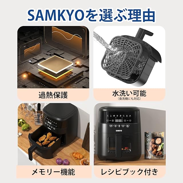 商品名:SAMKYO ノンフライヤー 4.2L 可視窓 大容量 1-4人用 エアフライヤー タッチパネル 日本語レシピ付き ノンフライヤー機 フライヤー 揚げ物 惣菜 F40 ブラック