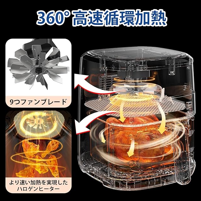 【1200Wの高性能加熱】 SAMKYOハロゲンヒーターを搭載し、加熱効率が大幅に向上し、食材を短時間で理想的な調理状態にすることができます。9つのファンブレードが360度全方位に循環加熱し、食材を均一に加熱し、サクサクの食感を実現できます。ヒーターには保護ネットが付いており、誤って触れて火傷を防ぎ、食材表面が加熱管に触れないようになっています。