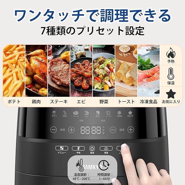 【多機能/7つのプリセット】 タッチパネルで簡単に操作でき、7つのプリセットが用意されています。ポテト、鶏肉、ステーキ、エビ、野菜、トースト、冷凍食品など、さまざまな美味しい料理ニーズに対応しています。予熱と保温機能も搭載されており、温度は40℃から200℃まで調整可能で、最長60分のタイマー設定ができます。また、個人の好みに合わせて時間と温度を設定し、便利な「お気に入り」機能を使用して設定を保存できます。迅速で効率的な料理の時間をお楽しみください。