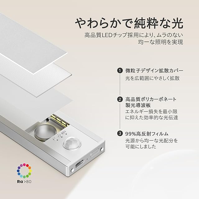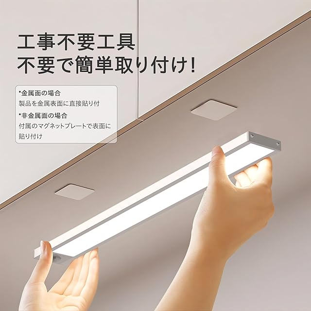 <b>〜「光のスマート化」で、毎日の生活を快適にアップグレード〜</b><br> <b>「工事不要・3秒設置」が革命的な便利さ!</b><br> マグネットor接着プレートで、金属・木材・プラスチックあらゆる素材に貼り付け可能。DIY未経験の方でも、場所を選ばず即設置!キッチンキャビネットの奥行きや、クローゼットの狭いスペースにもスッキリ収まる超薄型デザイン(厚さ1cm)です。<br> <b>人感センサーで「快適な生活」を実現</b><br> <b>高感度赤外線センサー</b>が3m先・120°の動きを検知。暗い廊下でスマホを探す手間や、荷物を持ったままのキッチン作業がラクに!<br> <b>消し忘れ防止機能:</b>人がいなくなると20秒後に自動消灯。節電効果だけでなく、電池切れの心配も軽減します。<br> <b> 光の情景を自由にデザイン</b><br> <b>無段階調光:</b>長押しで10%(ナイトライト)〜100%(作業用明るさ)までスムーズに調整。家族の就寝後も光で邪魔しません。<br> <b>3モード切替:</b><br> <b>常時点灯モード:</b>調理や読書時に最適な安定した明るさ。<br> <b>夜間モード:</b>寝室やトイレで目に優しい微光を持続。<br> <b>終日モード:</b>日中はセンサー作動、夜間は常時点灯のハイブリッド設定。<br> <b>プロ仕様の光品質</b><br> <b>均一拡散技術:</b>微粒子カバーと高反射フィルムで、スポットライトのような「照らしムラ」を解消。キッチン作業台全体を均一に照らします。<br> <b>6500K冷白色:</b>食材の鮮度確認や化粧時の色味チェックに最適な自然光。黄色みがかった光が苦手な方に特におすすめ!<br> <b>耐久性&実用性を徹底追求</b><br> <b>1500mAh大容量バッテリー:</b>フル充電時、常時点灯モード(50%明るさ)で約12時間連続使用可能。<br> <b>充電中も使用可能:</b>緊急時は充電ケーブルを接続したまま照明として活用できます。<br> <b>あらゆる空間で活躍するマルチライト</b><br> <b>キッチン:</b>キャビネット内の調味料探しや、シンク下の収納棚を照らす作業灯に。<br> <b>クローゼット:</b>服の色やデザインを確認するスポット照明として。<br> <b>廊下・階段:</b>夜間の安全確保に最適な足元灯。<br> <b>寝室・子供部屋:</b>就寝時のナイトライトや、読書用の補助照明として。<br> <b>充電も操作も全てシンプルに!</b><br> <b>ワンタッチ操作:</b>ボタンは1つだけ!短押しでON/OFF、長押しで調光。迷うことなく直感的に使えます。<br> <b>充電ランプ内蔵:</b>充電中は赤ランプ点灯、満充電で青ランプに切り替わり、ステータスが一目瞭然。<br> <b> 安心のとサポート</b><br> <b> PSE認証済:</b>国際安全基準をクリアした信頼性。<br> <b>「光」は、生活の質を決める小さな革命です。</b><br> このライトで、暗がりでのイライラを解消し、毎日の家事効率をアップさせてください。