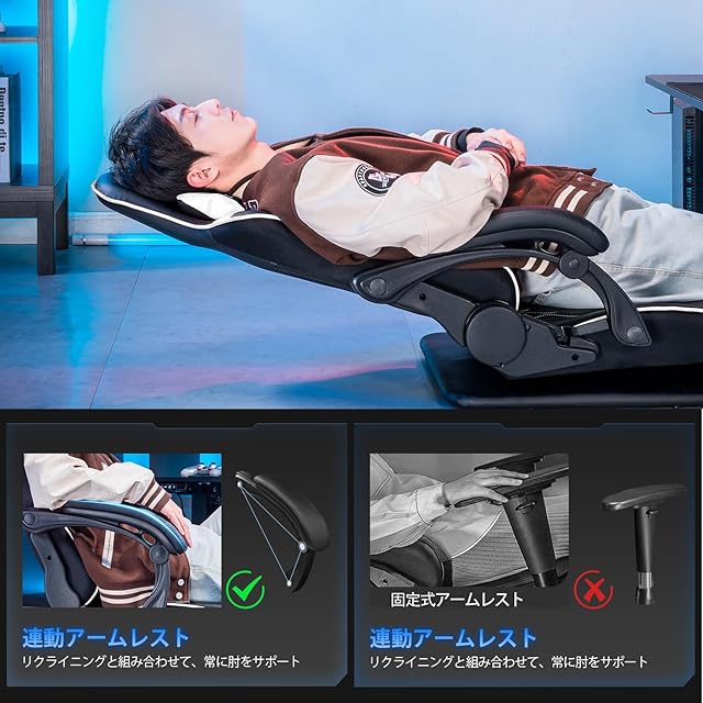 【165°までリクライニング機能】 座椅子の背もたれは90°から165°まで無段階に自由に調整可能です。連動アームレストが付いて、肘をサポートしてくれるので、読書やゲーム、そして睡眠など、どんな場面でも快適に過ごせます。