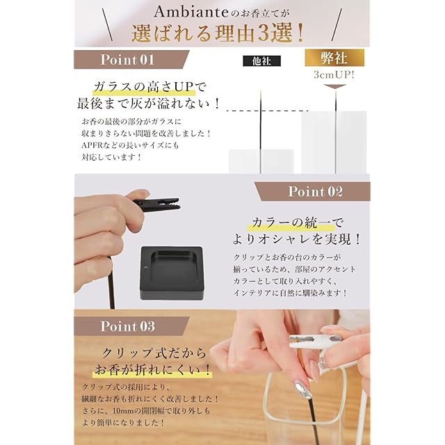 Ambiante(アンビアンテ)のお香立ては、2名のプロ監修のもと、商品企画されたお香立て。多様なお香に対応し、挟むだけの簡単セットで、水洗いも対応。ブラックとホワイトの2色展開で、インテリアに自然に馴染みます。