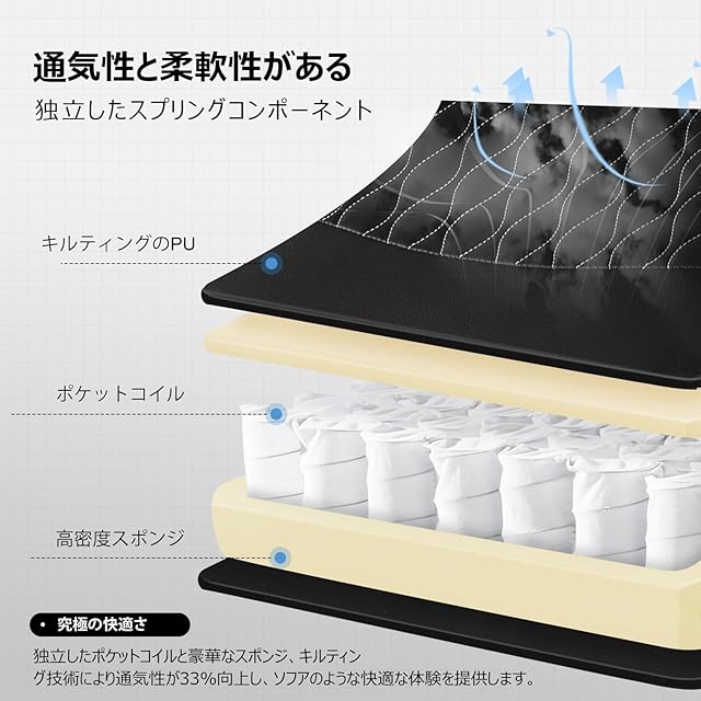 【芯材:ポケットコイルと高品質な非再生ウレタンの採用】先進のポケットコイルと高品質の非再生ウレタン技術を採用しており、ダブルの座り心地をご提供いたします。ポケットコイルは正確なサポートを提供し、非再生ウレタンはエコな素材で、安心感を提供します。