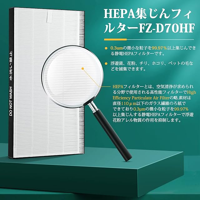 【機能】HEPA 集塵フィルター FZ-D70HFはpm2.5/スモッグ等の除去;浮遊菌、花粉、チリ、ホコリ、ペットの毛などを捕集できます。脱臭フィルター FZ-D70DFは料理臭、ペット臭、部屋干し衣類の生乾き臭、体臭、加齢臭などを消臭できます。