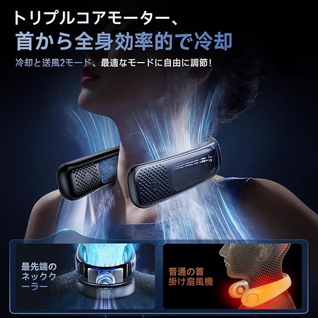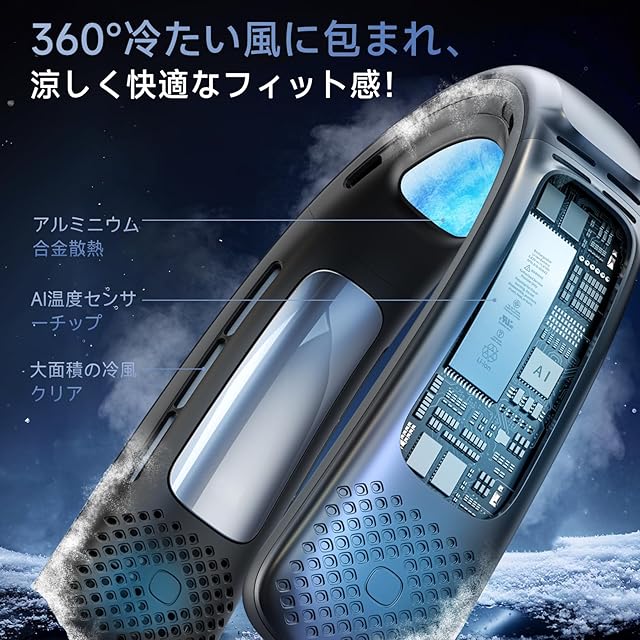「首元の冷却と360°送風との両立も出来て涼しさアップ、真夏のこの時期おすすめ!」真ん中の首元にTEC氷磁器冷却半導体が搭載し、一日中溶けない保冷剤が首にある感じで血液や体温を直接冷やす感じを満喫できます。ペルチェ素子による強力な冷却効果で、首元を素早く冷やすことだけでなく、周りの冷風を継続的に送り出し、実に体感温度を10°下げます。首にかけるだけで両手が自由に使えるため、通勤・作業・スポーツ中でも快適に使用可能。