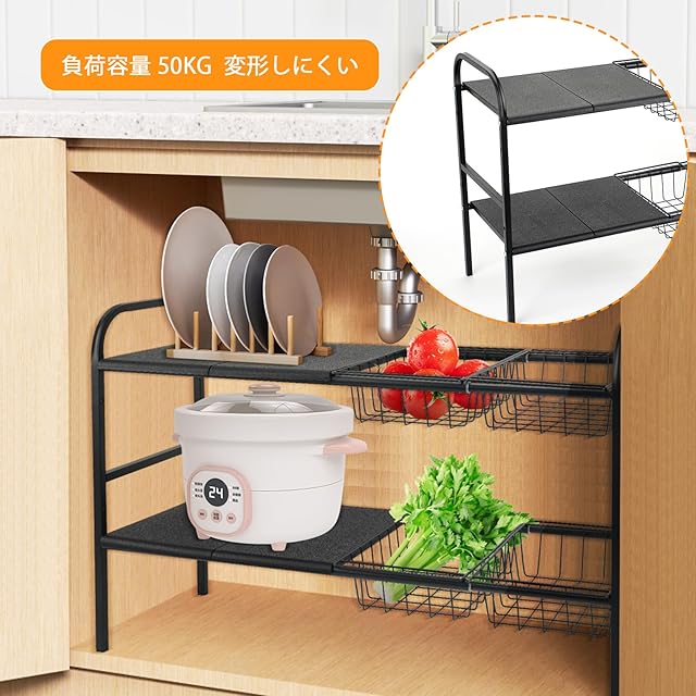 製品仕様:幅53-88×奥行25×高さ44cm、収納バスケット:26×16.5×7cm、シンク下伸縮棚は変形しない厚手の素材でできており、丈夫で耐久性があります。キッチン、バスルーム、シンク下、ワードローブなど、あらゆる場所に適しています。鍋やフライパンなどの重いものを収納することができ、変形することなく安全でしっかりしています。