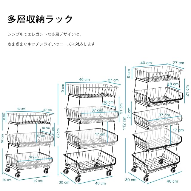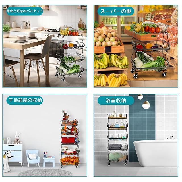 【自由に組み立て、幅広く使える】本製品はスタッキング式なので、お好みで1段から5段まで自由に組み立てられます。またはバスケットを一個一個を分けて収納ボックスとして、食器、調味料、食材、台所の小物などの収納にも適用します。使い方はアイディア次第です。