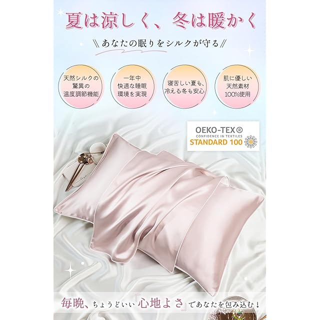 【 一年中快適な温度調整】シルクは天然の温度調整機能を持つ素材です。夏は余分な熱や湿気を逃がし、涼しく快適に過ごせます。冬はしっかりと暖かさを保つので、季節を問わず心地よい眠りをサポートします。