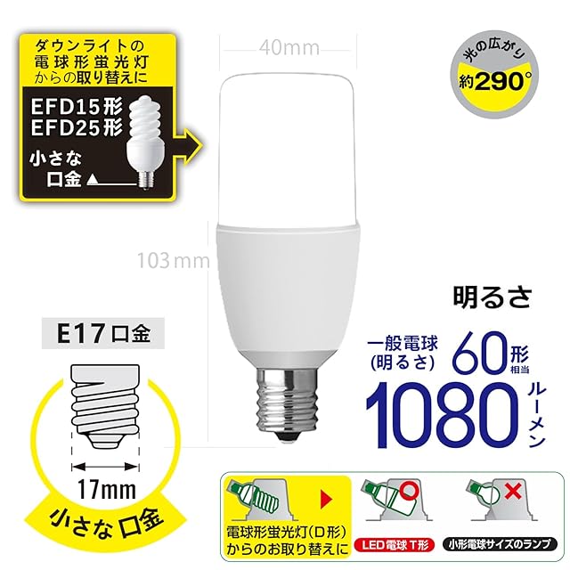 LED電球 E17 小さな 口金 T形タイプ 口金直径17mm 電球60W形相当 7.2W 一般電球・T形タイプ 密閉器具対応