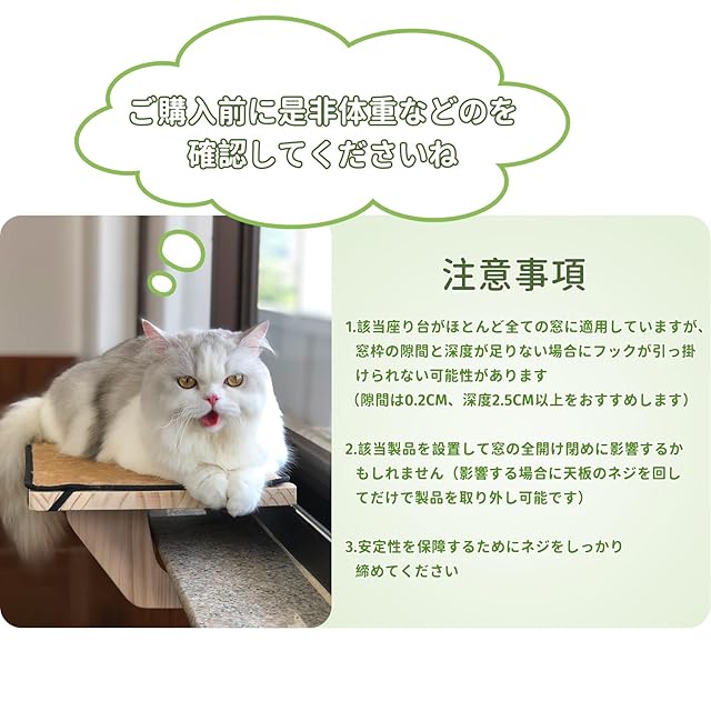 【製品仕様】当該猫窓ベッドは耐荷重試験をクリアしており、10KGまでの重さに耐えられますが、猫の飛び乗りなどの衝撃を考慮し、耐久性を保つため8KG以内での使用をおすすめします。サイズは幅42×奥行29×高さ15cmで、さまざまな猫種に適しています。