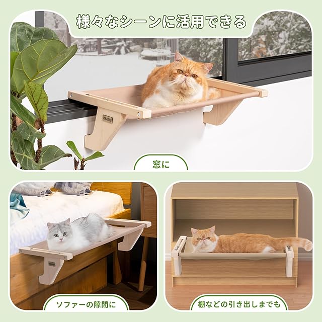 商品名:Petsfit 猫窓ベッド 窓用ハンモック 猫ハンモック 木製 しかっりした物理構造 窓用座り台 キャットウォーク 賃貸 ウィンドウベッド 日向ぼっこ 日光浴 マット付き 取り付け式 水洗い 耐用 安定 組み立て簡単 取り外し可能なマット ストレス解消 省スペース 日本語説明書付き