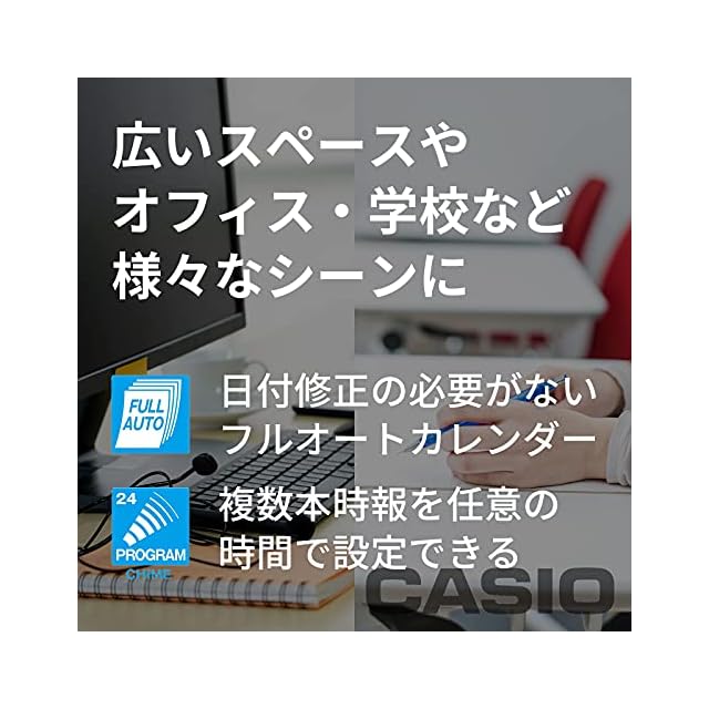 機能:電波受信機能 (自動受信/手動受信)、デュアルタイム表示、カレンダー表示、プログラム時報機能 (セット本数:24本、報音:ウエストミンスターチャイム)、チャイム音量調節、12/24時間制表示切替