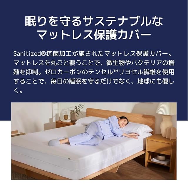 Sanitized抗菌加工が施されたマットレス保護カバー。マットレスを丸ごと覆うことで、微生物やバクテリアの増殖を抑制。ゼロカーボンのテンセルリヨセル繊維を使用することで、毎日の睡眠を守るだけでなく、地球にも優しく。