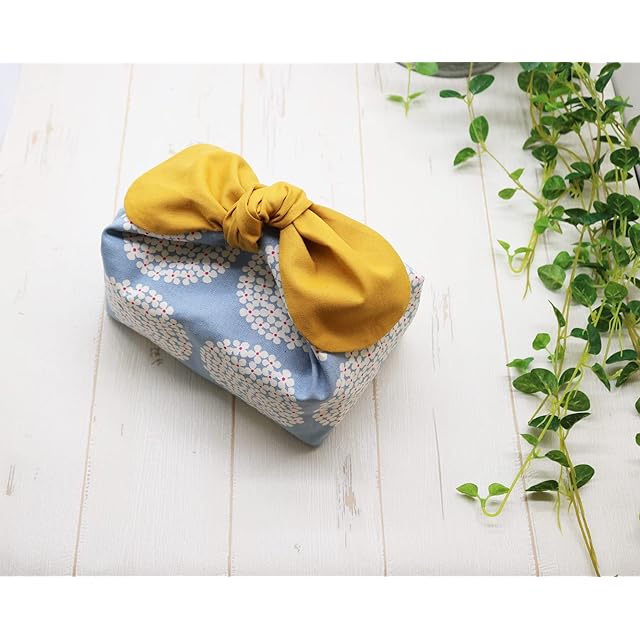 商品名:お弁当袋 保冷保温 ランチバッグ 紐なし 結ぶタイプ あづま袋 リボン (あじさい ブルーグレー×黄色)