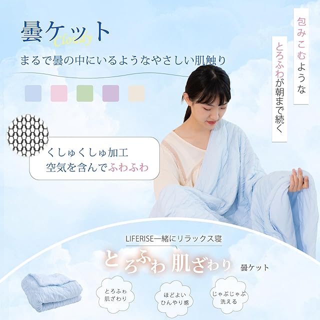 暑くて寝苦しいとお悩みの方には、是非おすすめ商品です!最強ひんやり感!極上の柔らかさ!蒸レズに朝までさらさらLIFERISEのクールケット!シングル140*190cmとハーフケット100*140cmの2つサイズと、sky-blue、pink、green、ivy、lavender-purperの5色用意しております、ぜひご楽しみに!