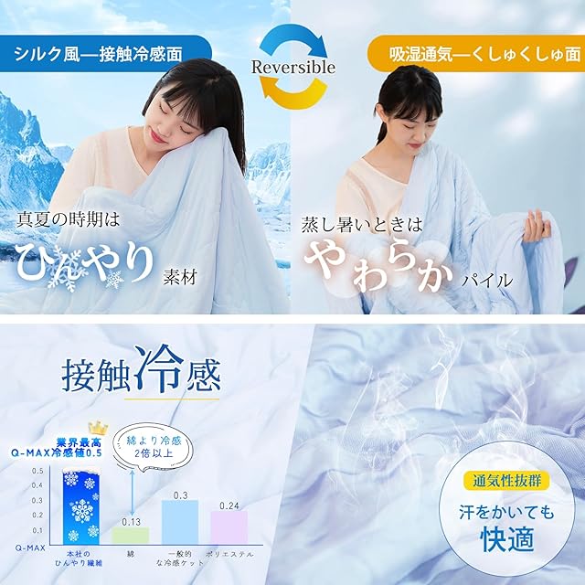 「シルク風面・ひんやり」片面ひんやり面が接触冷感生地を使用、触ってびっくりひんやり涼しくて、冷感値は0.5w/cm²に達し、綿素材の3.8倍以上です。触れた瞬間に感じる肌触りの良い冷感としたキルトケット!冷房との併用でさらにひんやり!