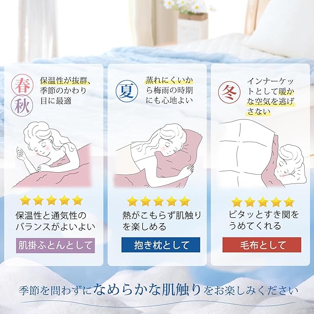 「リバーシブル・一枚2役」暑い夏には『シルク風面』を肌側にして、素肌によろこぶひんやりタッチ!春、秋肌寒いときに『くしゅくしゅモダール面』を肌側にして、程よい厚みのふんわりタッチ!表地が女性用の肌着素材天然特殊繊維『モダール』100%を使用してます。冬寒い季節は毛布や羽毛布団と組み合わせて、ましゅまろのような肌触り、一年中使えるオールシーズンかけ布団です。