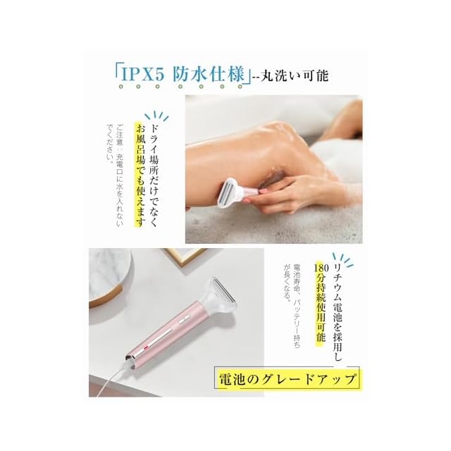【IPX5防水仕様&丸洗い可能】革新的な防水機能付きで衛生面に心配なしの電気シェーバーです。快適なムダ毛処理したあと、交換ヘッドの刃とアタッチメントを取り外し、専用の掃除ブラシで刃に絡まった毛を落とせて、直接に水で洗い流せることができます、いつも衛生的な状態を保ちます。交換ヘッドだけでなく本体も水で丸洗い可能ですから、お風呂、浴室、洗面所などの場合でも気楽にご使用頂けます。 ※製品の本体を長時間水の中に浸さないでください。