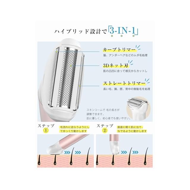 【切れ味抜群の3in1ボディシェーバー】3Dフローティングのネット刃、カーブ刃とストレート刃が一体となった3in1ボディシェーバーは、大部分のムダ毛処理に最適です。太い毛も細い毛も、長い毛も短い毛も、根元からカットし、スピーディーに処理できます。ストレート刃は胸、背中、足などの長い毛に適用、カーブ刃は脇などの剃りにくい部分により良いカットします。ネット刃は全身広範囲で短い毛や剃り残しをきれいに処理します。全身を剃りたい人には、3in1ボディシェーバーはおすすめ、全身くまなくつるスベ美肌へ導きます。